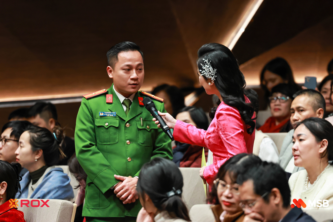 Có mặt ở hàng ghế khán giả, thiếu tá Trịnh Minh Tùng, Trưởng Công an thị trấn Phú Xuyên, huyện Phú Xuyên, Hà Nội, chia sẻ: “Tôi vô cùng vinh dự và tự hào khi có mặt tại khán phòng Nhà hát Hồ Gươm, được thưởng thức những tiết mục đặc sắc của các nghệ sĩ. Mỗi giai điệu vang lên khơi dậy niềm tự hào trong mỗi cán bộ, chiến sĩ Công an nhân dân, đặc biệt là những người công tác tại cơ sở như tôi. Đêm nhạc không chỉ là một bữa tiệc nghệ thuật mà còn tiếp thêm động lực để chúng tôi tiếp tục cống hiến, viết tiếp những trang sử hào hùng của lực lượng Công an nhân dân”.