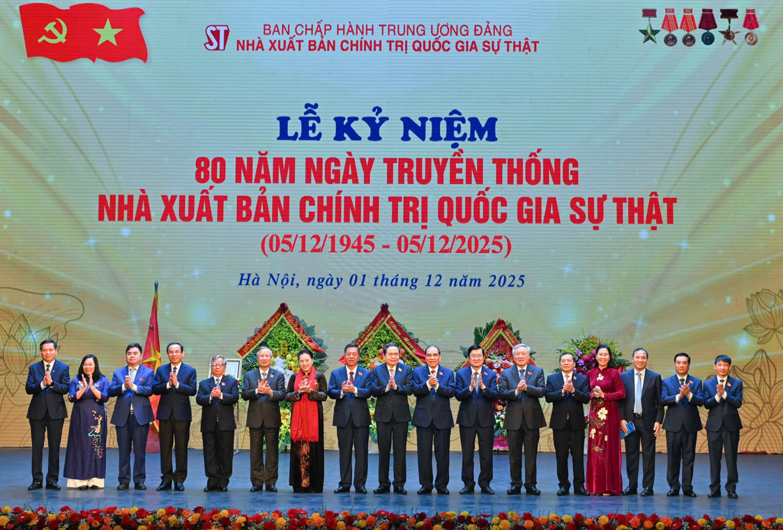 Sáng 1/12, tại Hà Nội, Nhà xuất bản Chính trị quốc gia Sự thật long trọng tổ chức Lễ kỷ niệm 80 năm Ngày truyền thống (5/12/1945-5/12/2025) và đón nhận Huân chương Lao động hạng Nhất. Tổng Bí thư Tô Lâm gửi Thư và lẵng hoa chúc mừng.