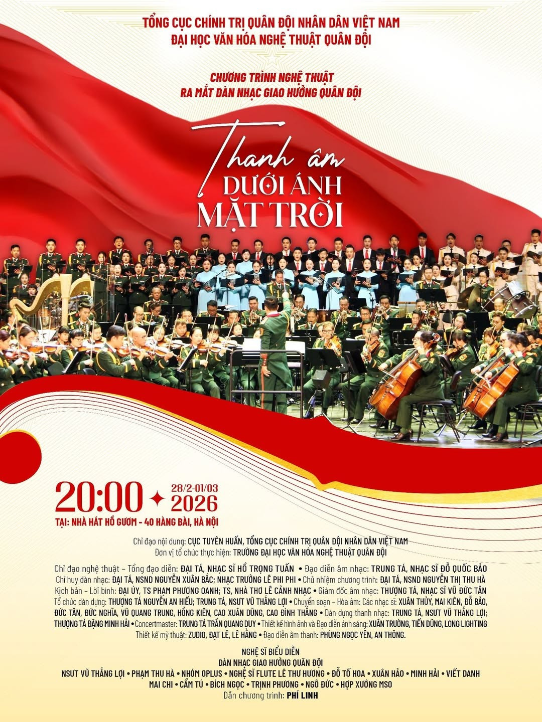 "Thanh âm dưới ánh mặt trời" – chương trình chính thức ra mắt Dàn nhạc Giao hưởng Quân đội (Military Symphony Orchestra – MSO) sẽ diễn ra vào 20 giờ ngày 28/2 và 01/3 tại Nhà hát Hồ Gươm.